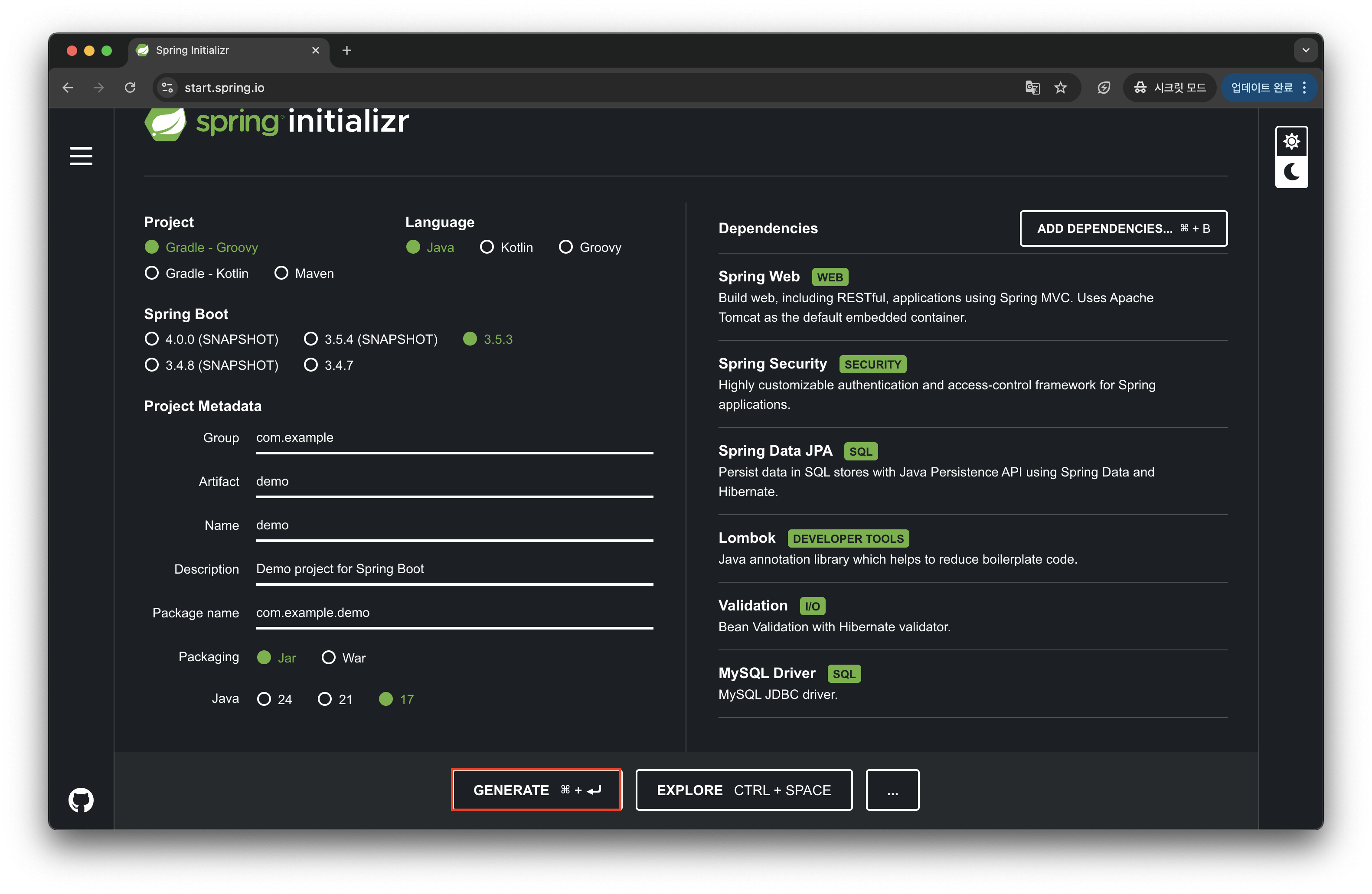 1. start.spring.io 접속