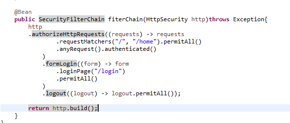 SecurityFilterChain는 Bean을 직접 설정하여 사용하는 방식입니다.