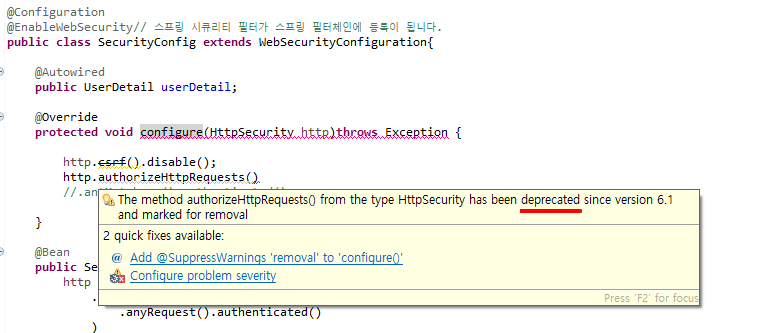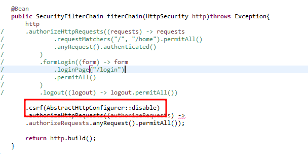 5.x 버전 이상에서 WebSecurityConfigureAdapter class와 HttpSecurity에서의 .csrf() 함수는 더 이상 사용되지 않는다고 합니다.