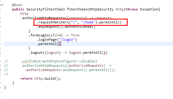.requestMatchers("/", "/home").permitAll()